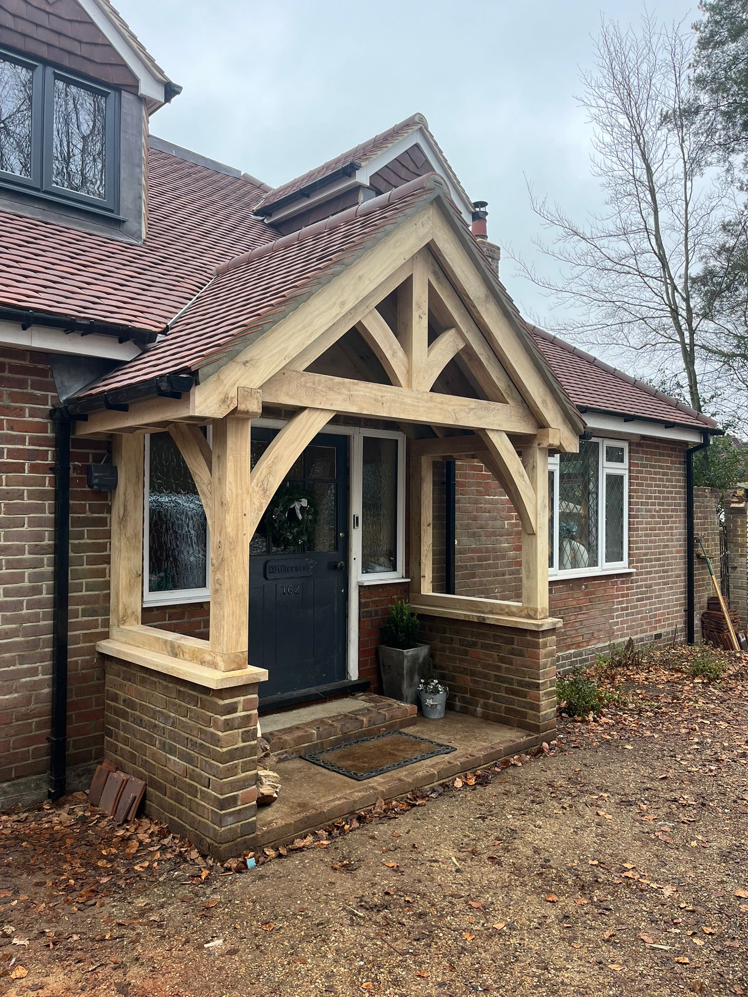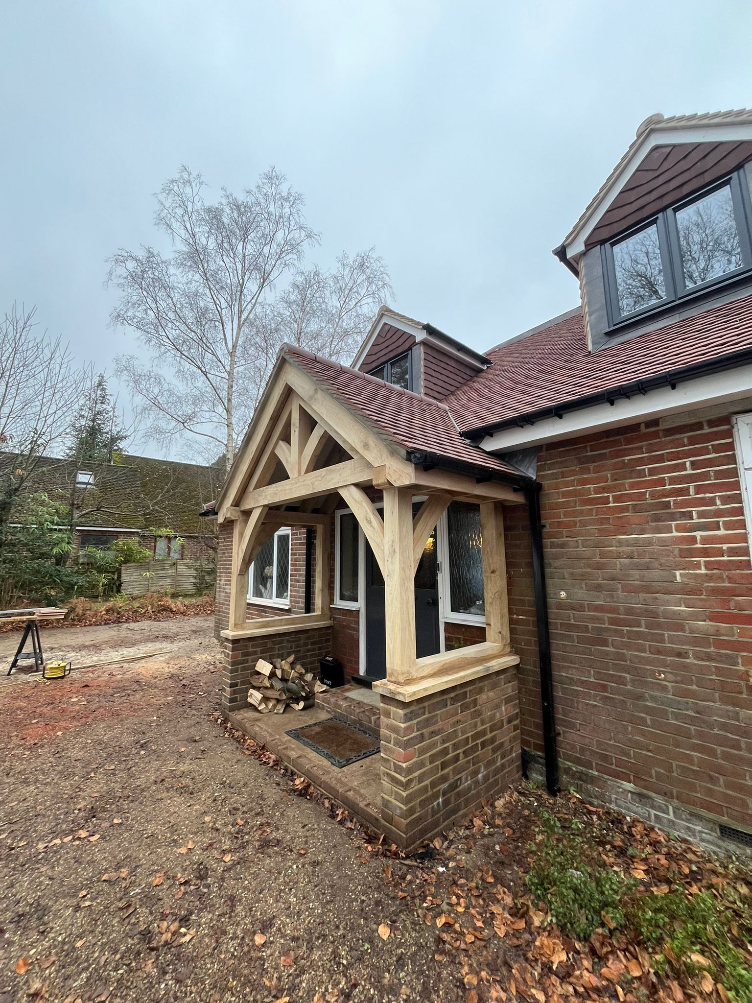 This bespoke carpentry project involved the design and installation of a custom oak framed porch for a residential property in Lightwater. Crafted from high-quality oak, the porch was carefully constructed to complement the character of the home while providing a strong, durable, and visually striking entrance.