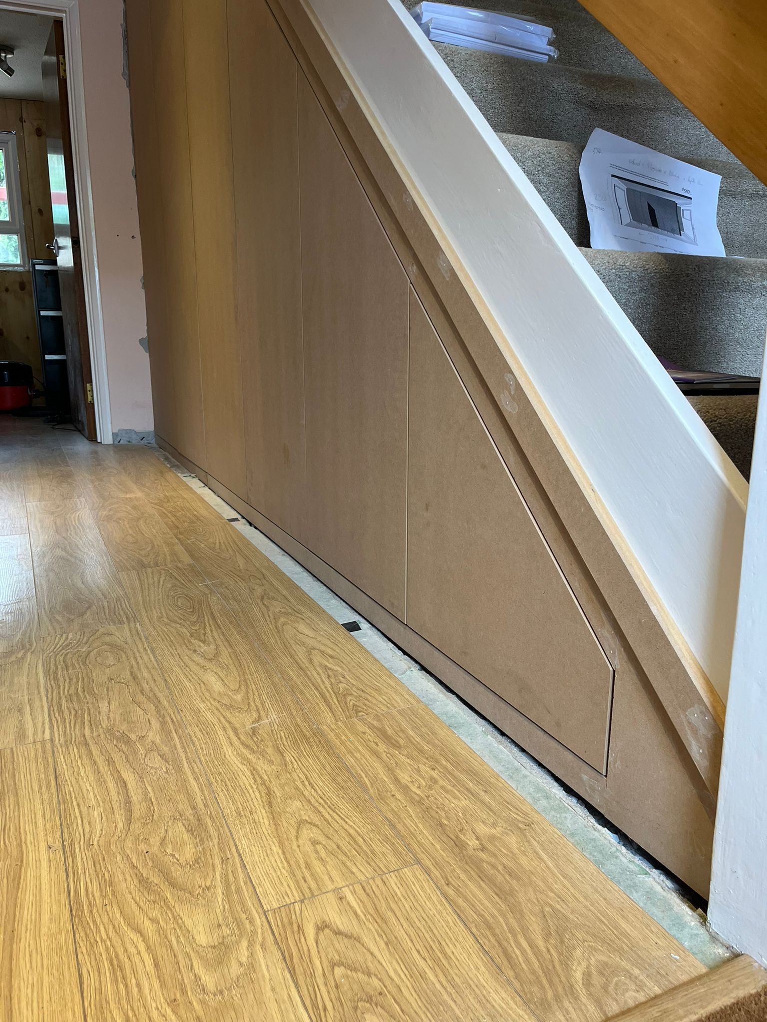 This project involved designing and installing custom understairs storage for a home in West Byfleet. Our team carefully measured the space to create a practical, bespoke solution that maximises storage without compromising the hallway’s aesthetic.